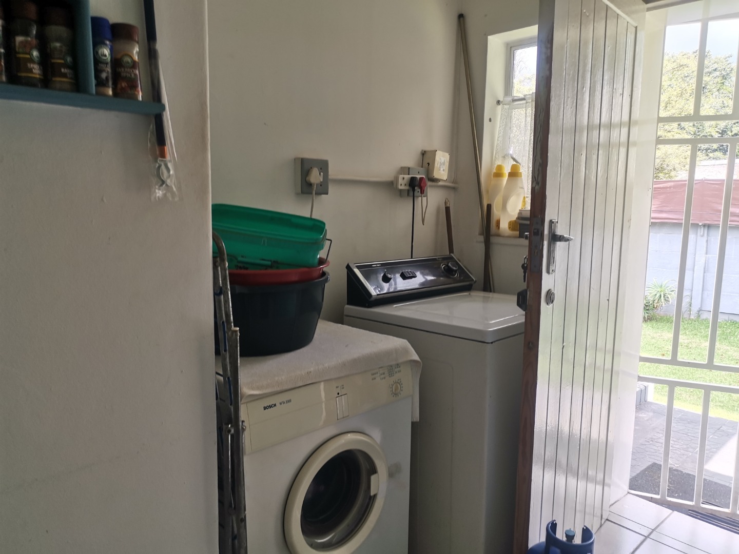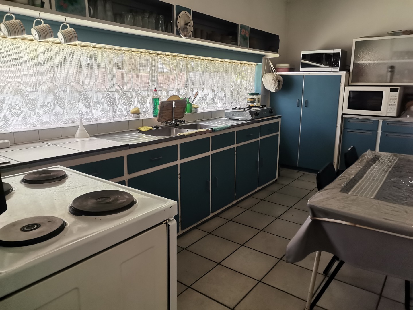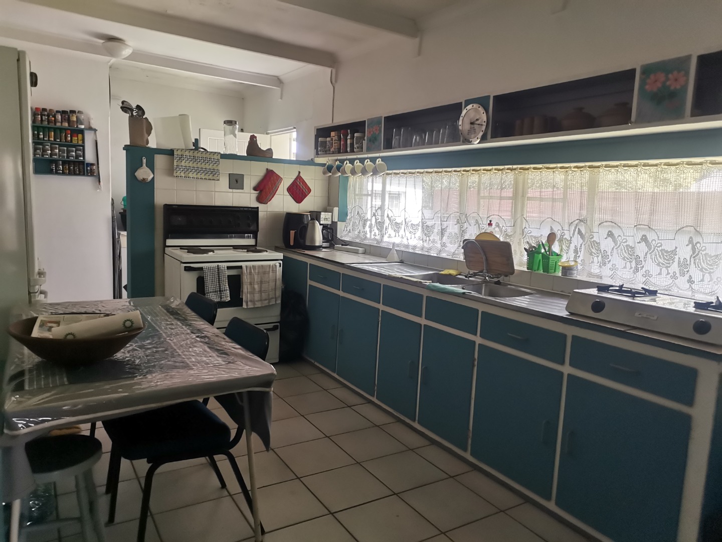 The heart of this home is its vintage-style kitchen, boasting ample counter space and extensive storage provided by teal base cabinets. A large window positioned above the sink ensures a bright and inviting atmosphere, complementing the functional layout which includes a free-standing oven/stove and a separate gas hob. A convenient, dedicated laundry room with direct outdoor access adds to the home's practicality.