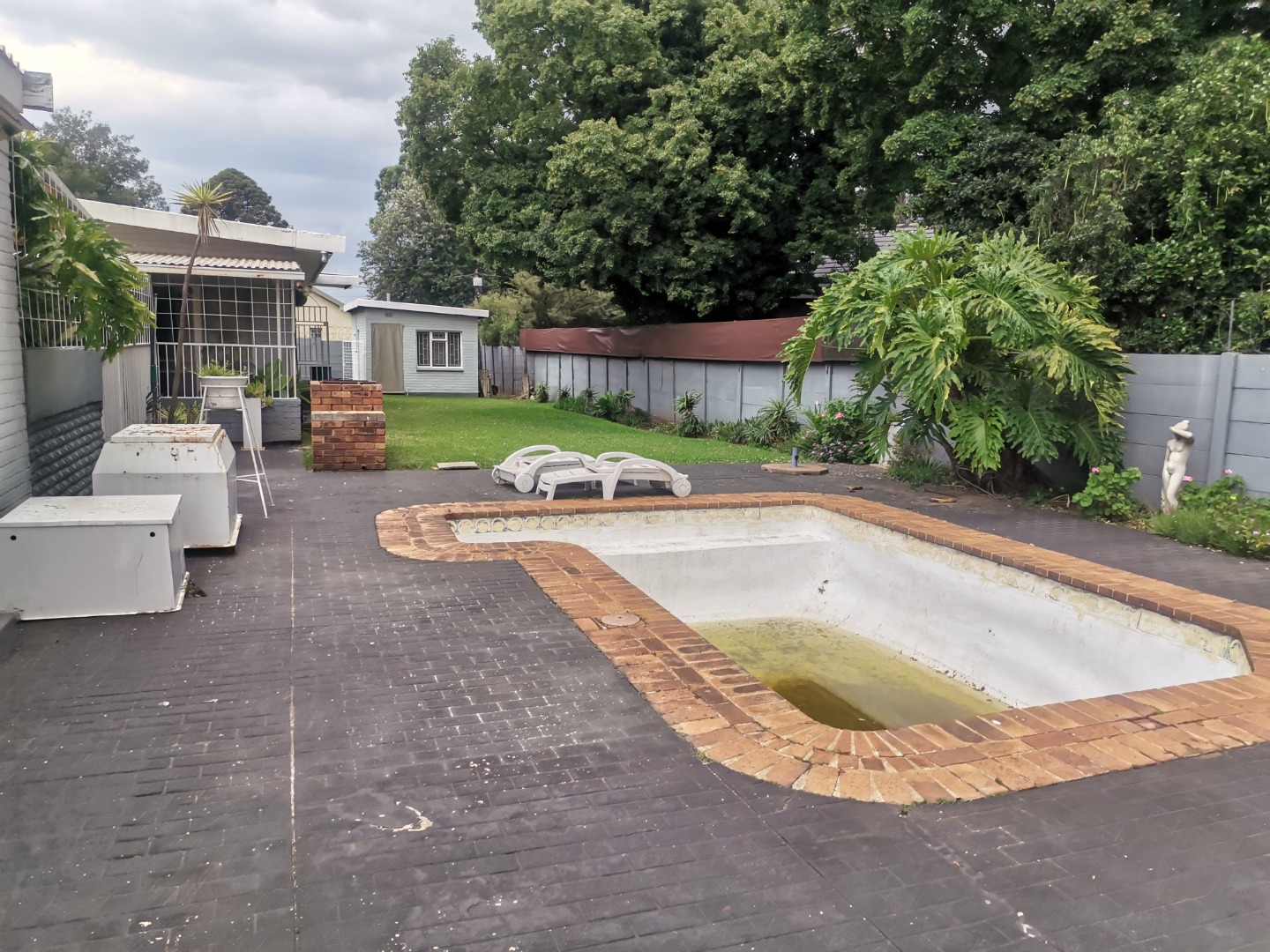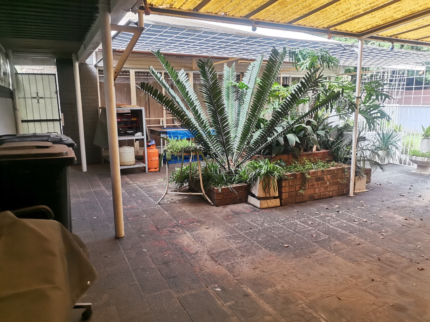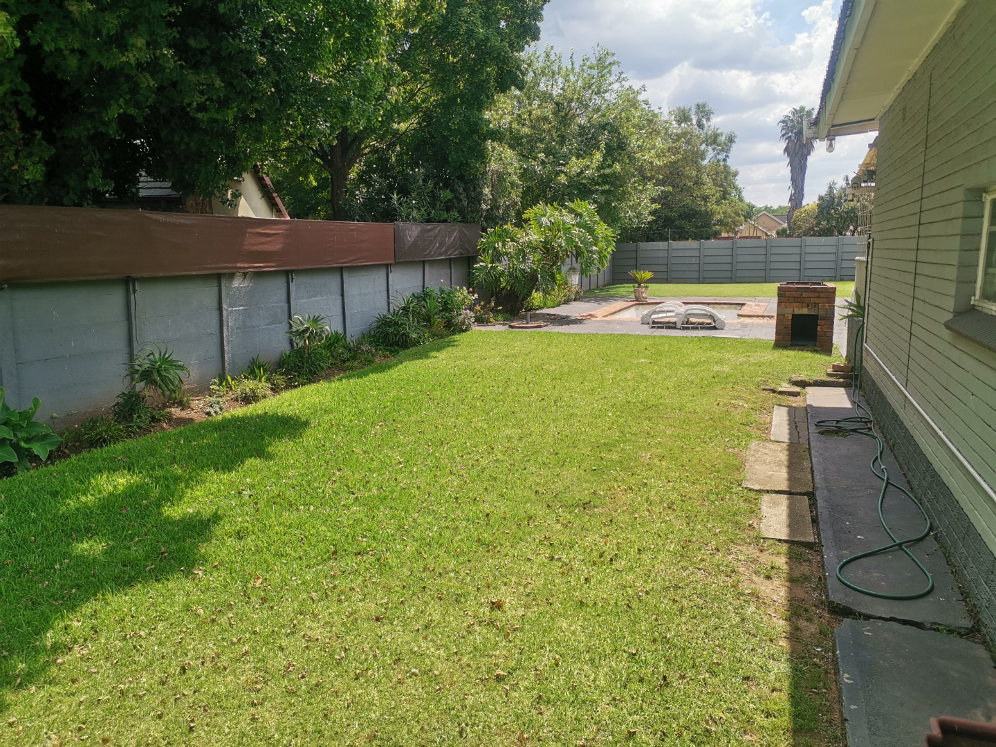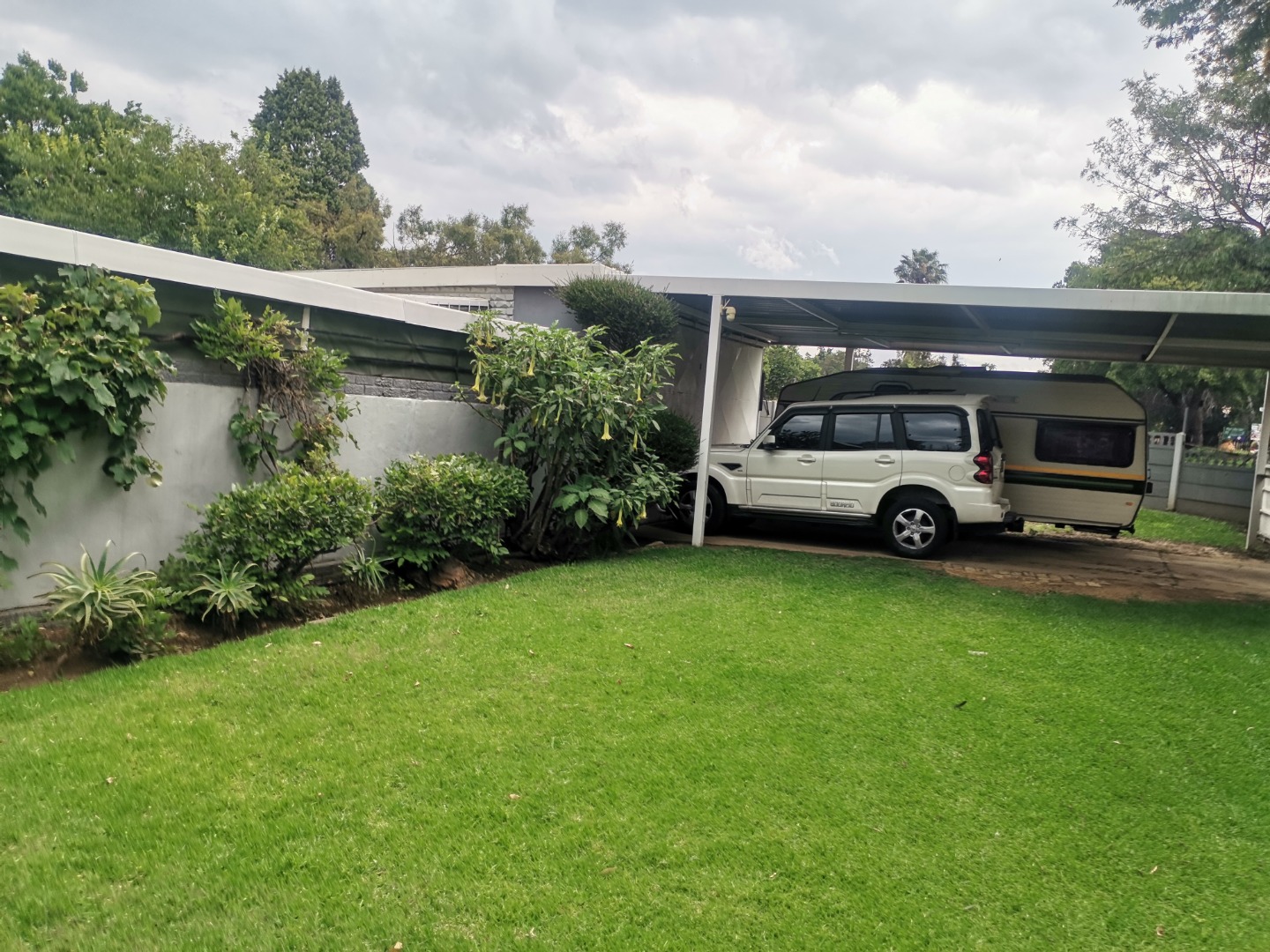 Outdoors, the generous 1175 sqm erf provides a substantial green lawn and established garden beds, perfect for relaxation and outdoor activities. Practical covered parking is available via a functional carport, capable of accommodating multiple vehicles, ensuring convenience for residents and visitors alike.